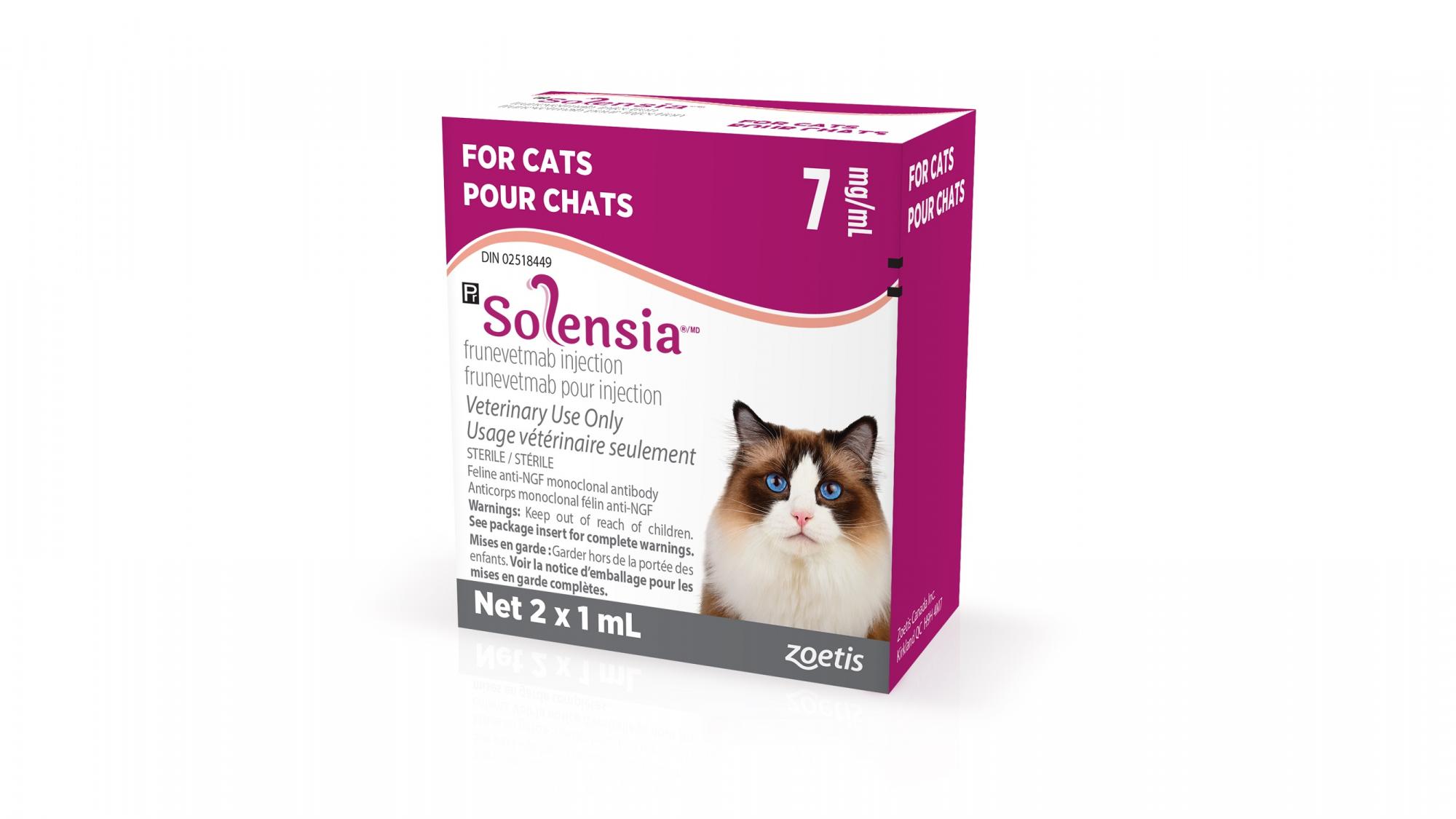 Соленсия - препарат нового поколения, созданный для снятия боли при остеоартрите у кошек. Остеоартрит является частым заболеванием суставов у домашних кошек, в особенности у пожилых, и может вызывать сильные болевые ощущения и дискомфорт. В составе Соленсии находится активное вещество фруневетмаб (7 мг/мл), препарат представлен в форме стерильного раствора для инъекций.